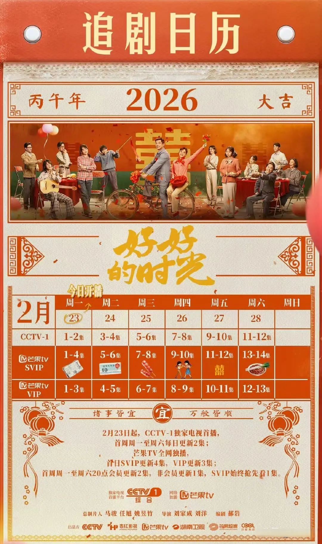 该剧将于2月23日也就是今晚20:00,该剧将作为中央广播电视总台新春大剧在CCTV-1黄金档、芒果TV同步开播,首播两集,会员有加更福利!